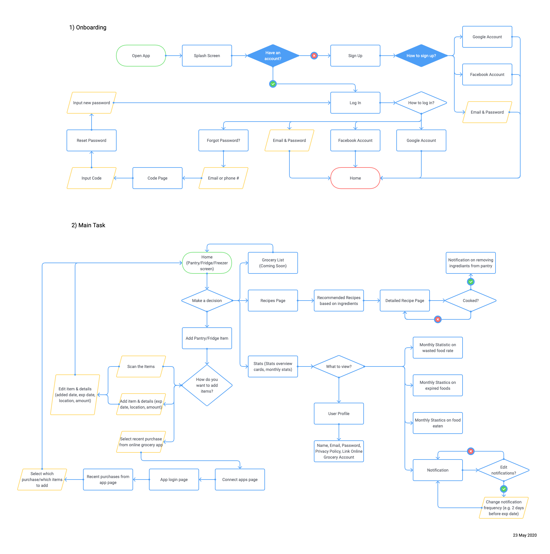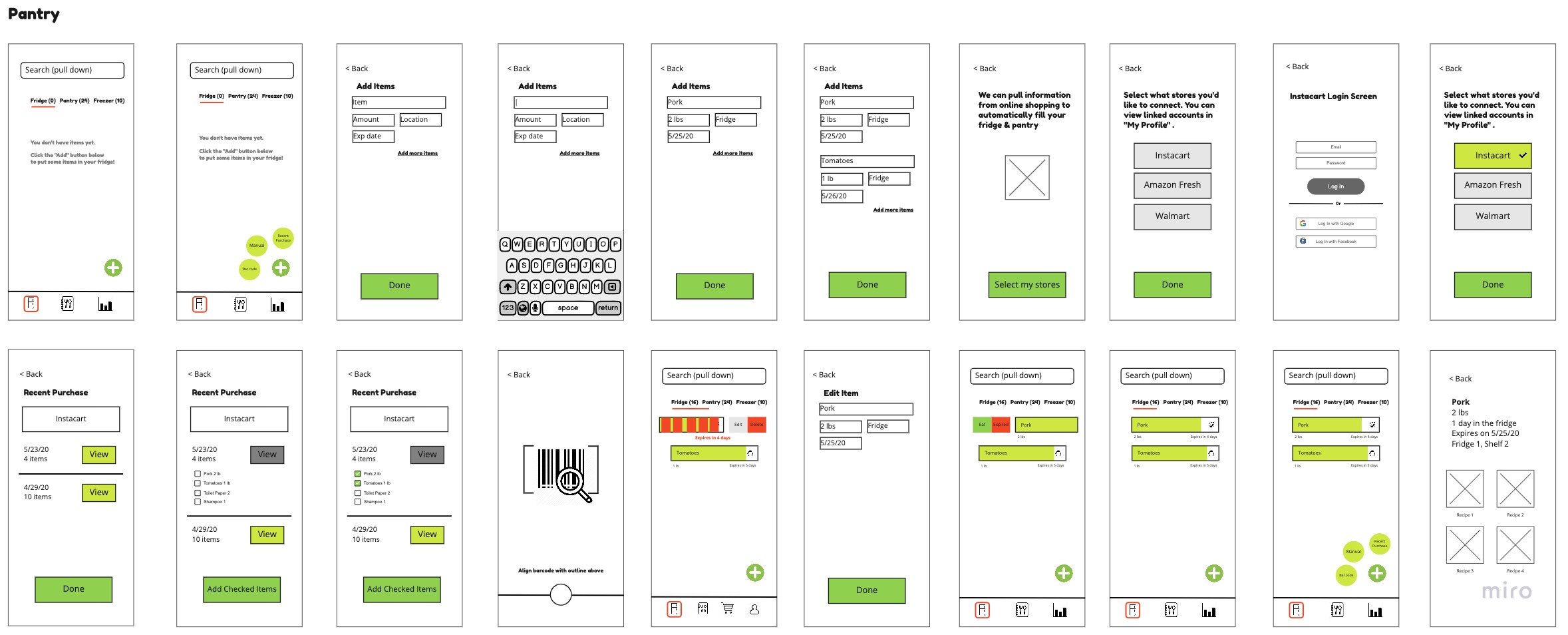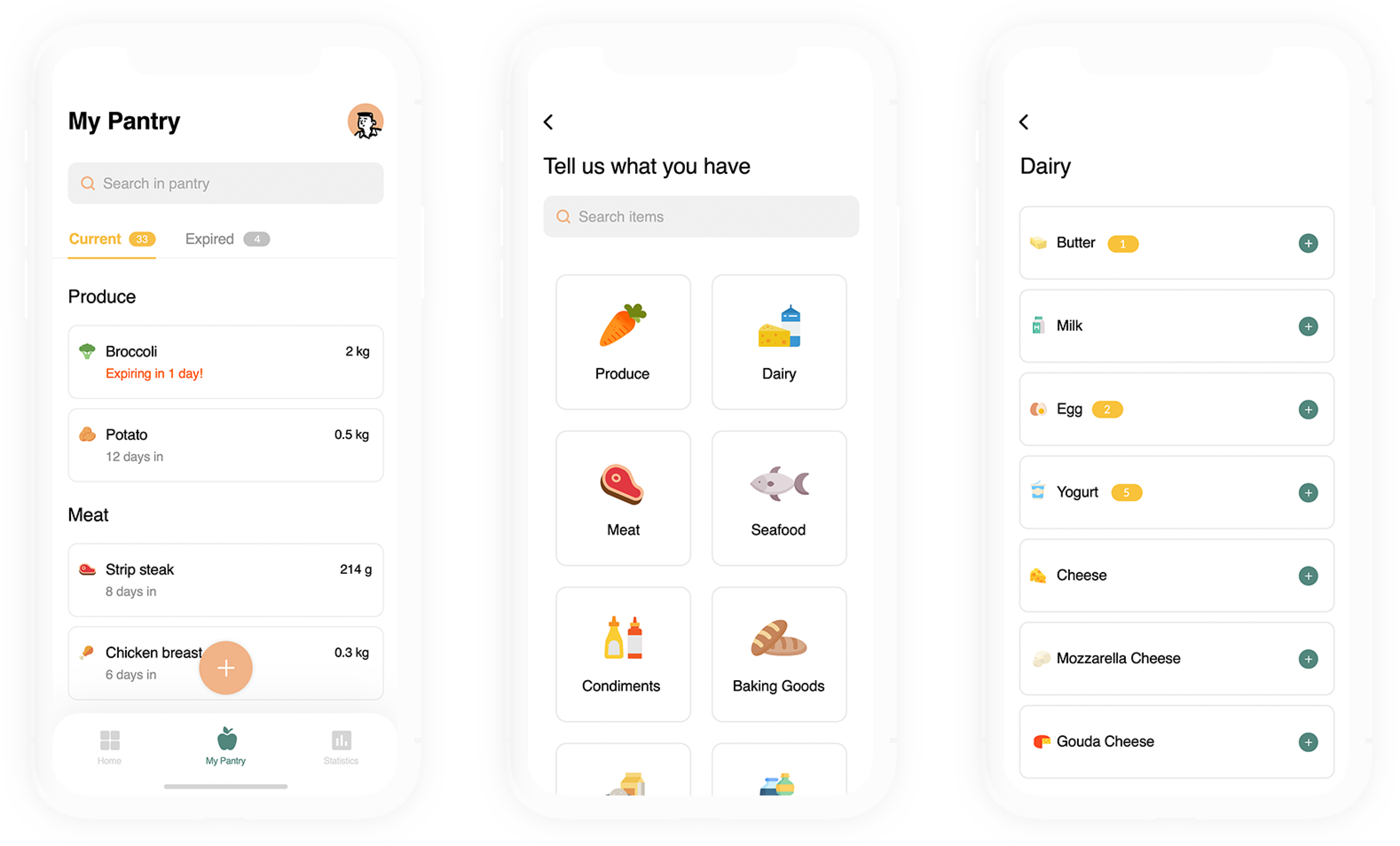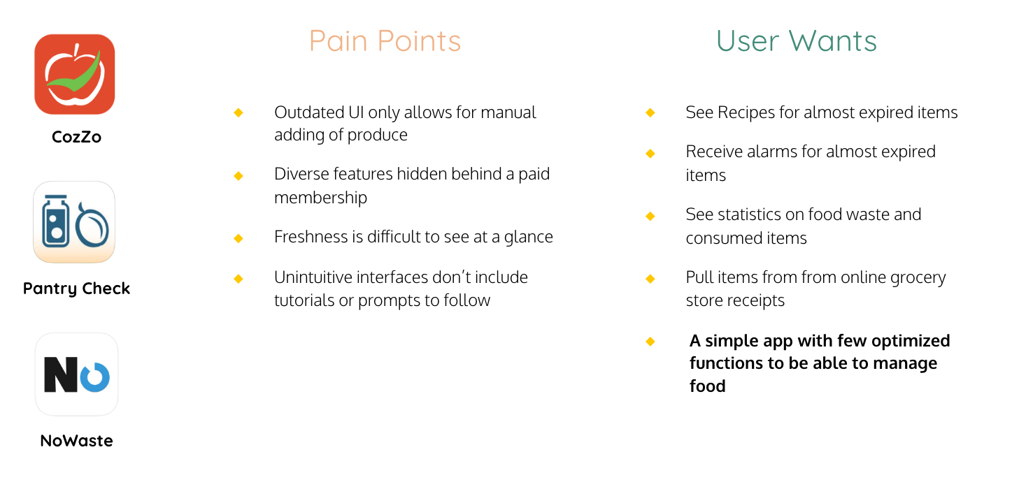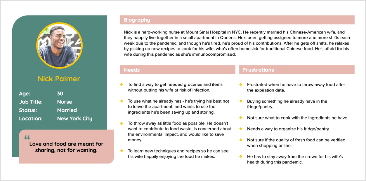 During this pandemic, our user, Nick, is trying his best to stay at home. So he wants to use up the ingredients he's been saving up and he is frustrated when he finds spoiled food at the back of his fridge. Nick wants to throw away as litdtle food as possible so he needs to find a way to manage his fridge and pantry. He thinks “Love and food are meant for sharing, not for wasting.”