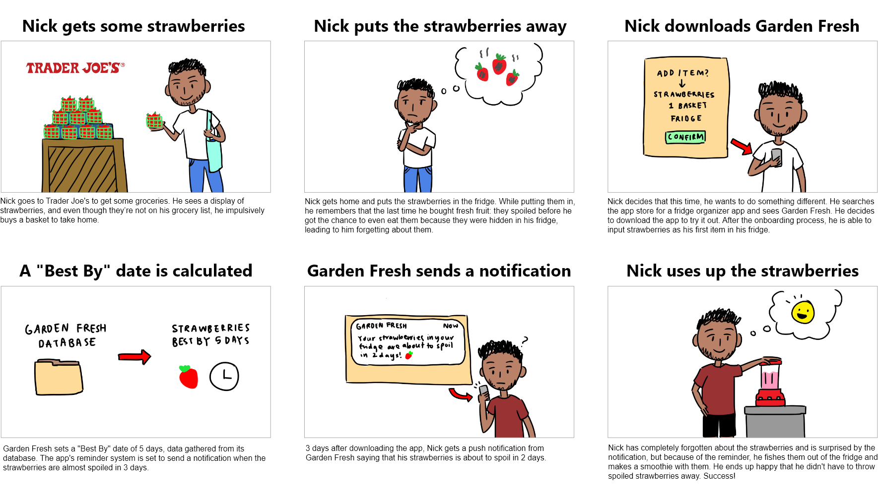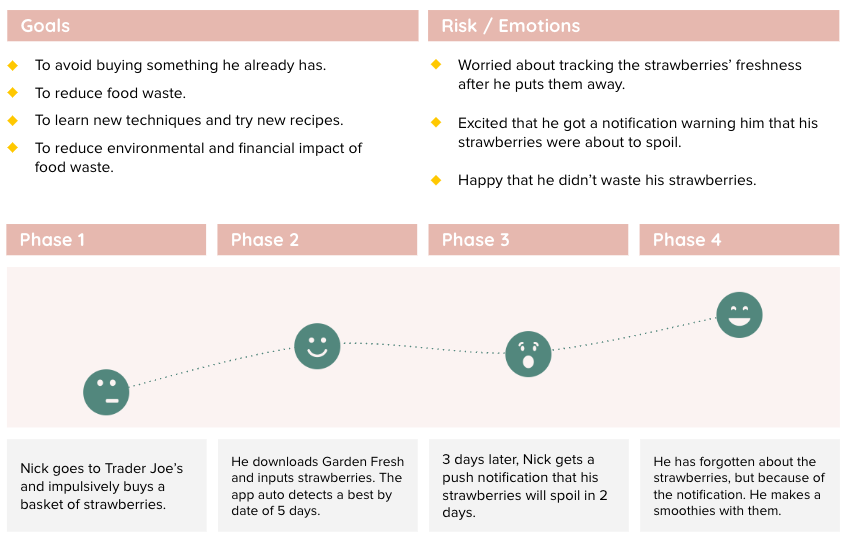 To further define what our persona wants and needs to fulfill, we created a user scenario and storyboard to help us visualize our user’s experience.