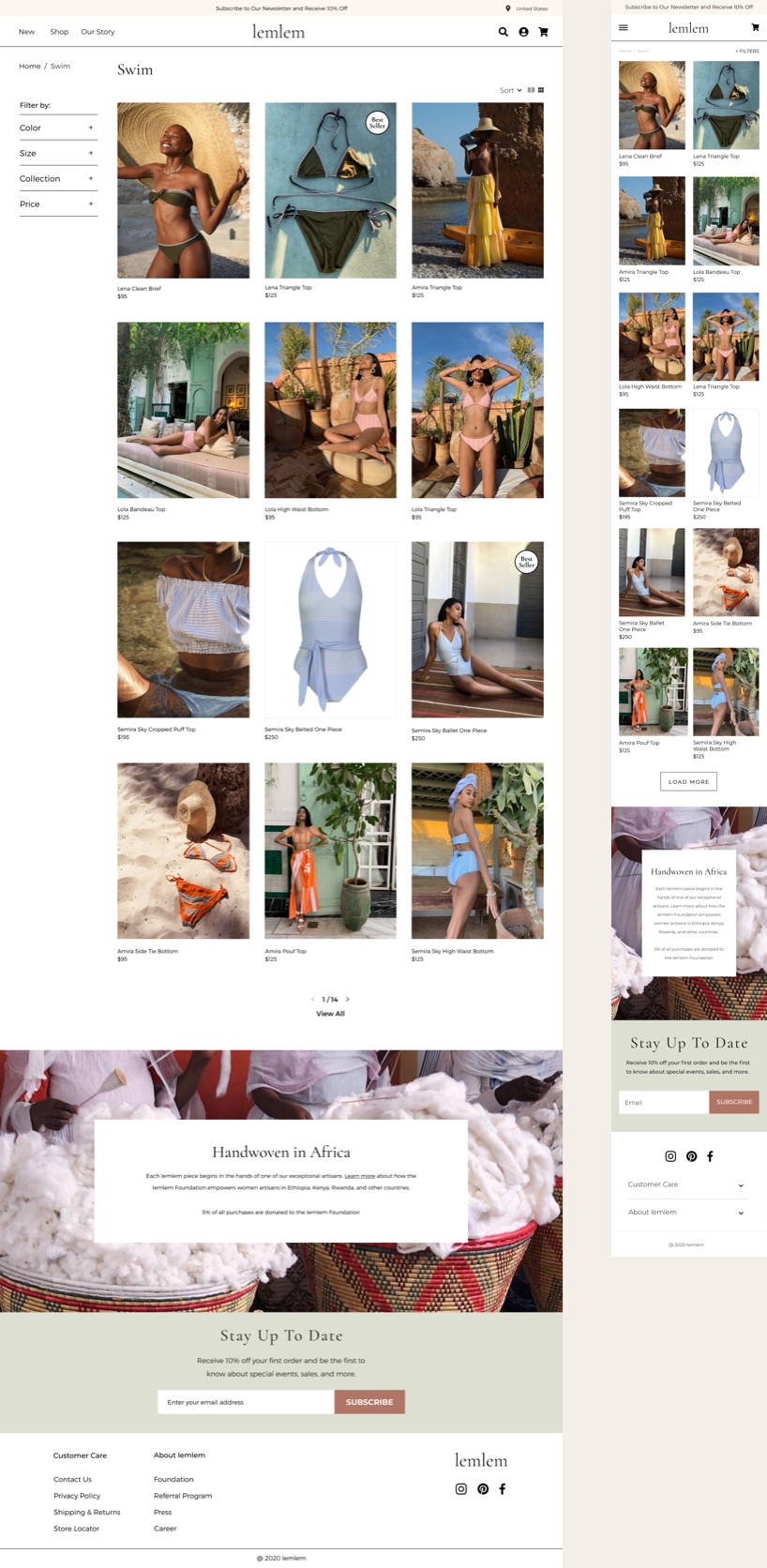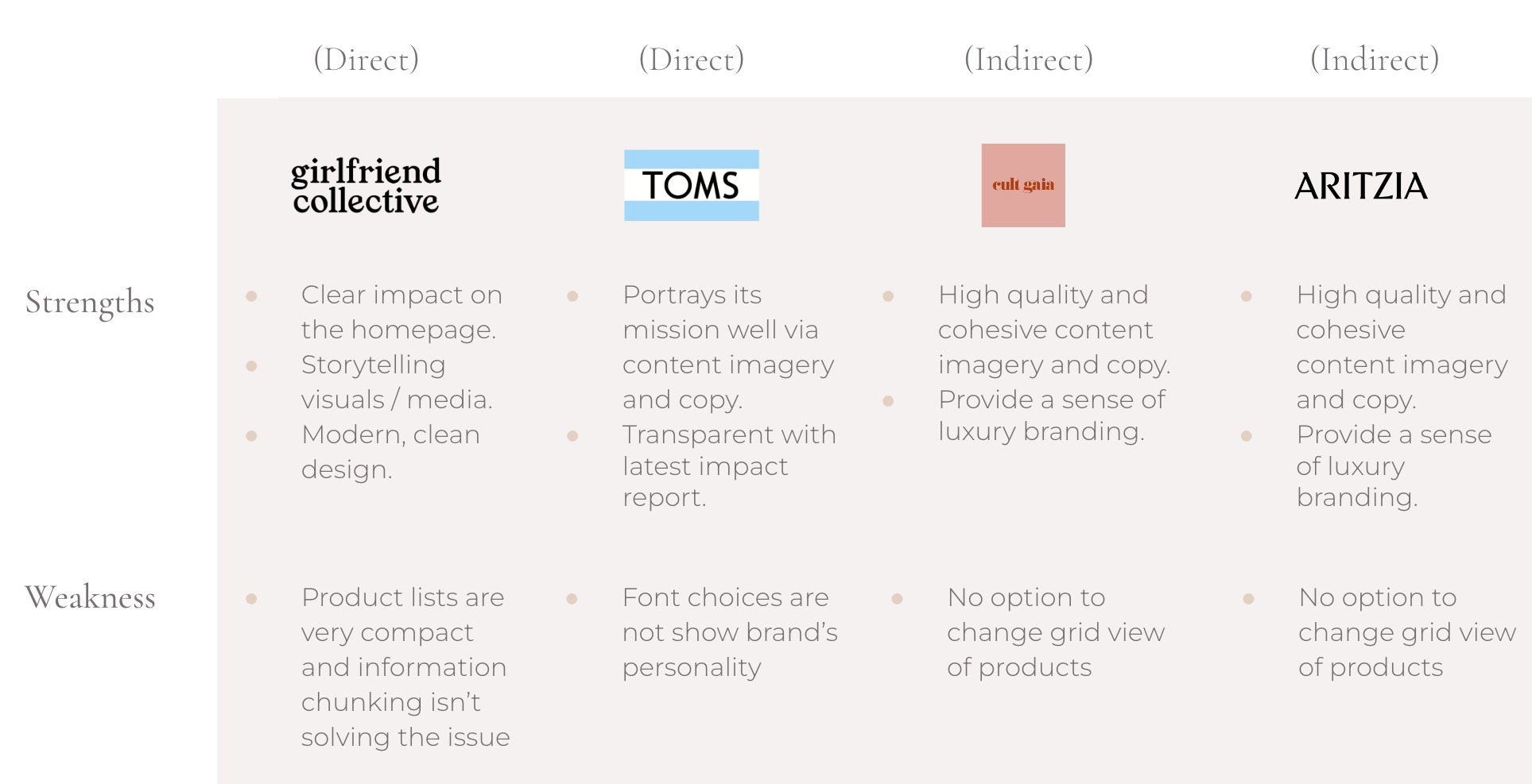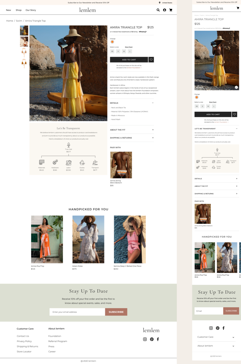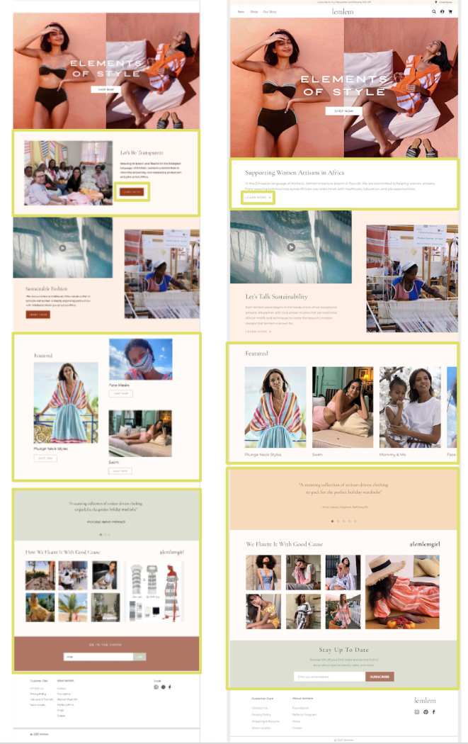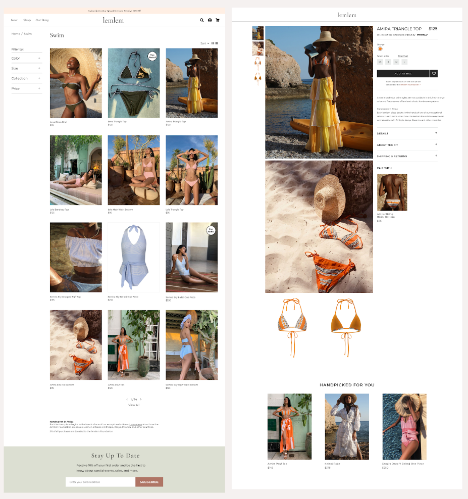 To have a better understanding of Lemlem website’s strengths and weaknesses, we’ve conducted competitor analysis. We chose two direct and indirect competitors. Direct competitors were clearly showing their mission statement and brand story on the homepage with charts and images. Other brands were providing high-quality content imagery, and their modern and clean design adds credibility to their price point.