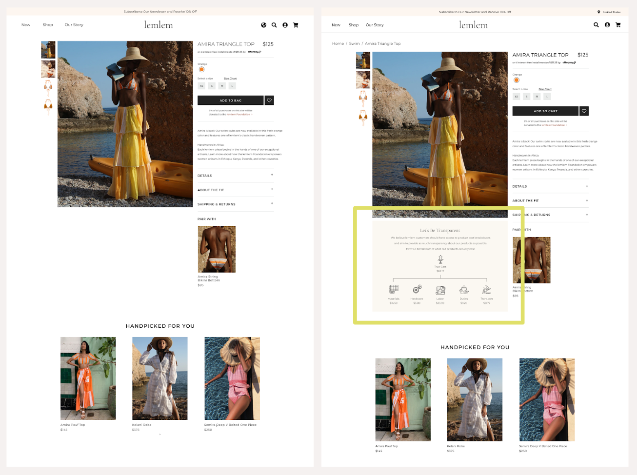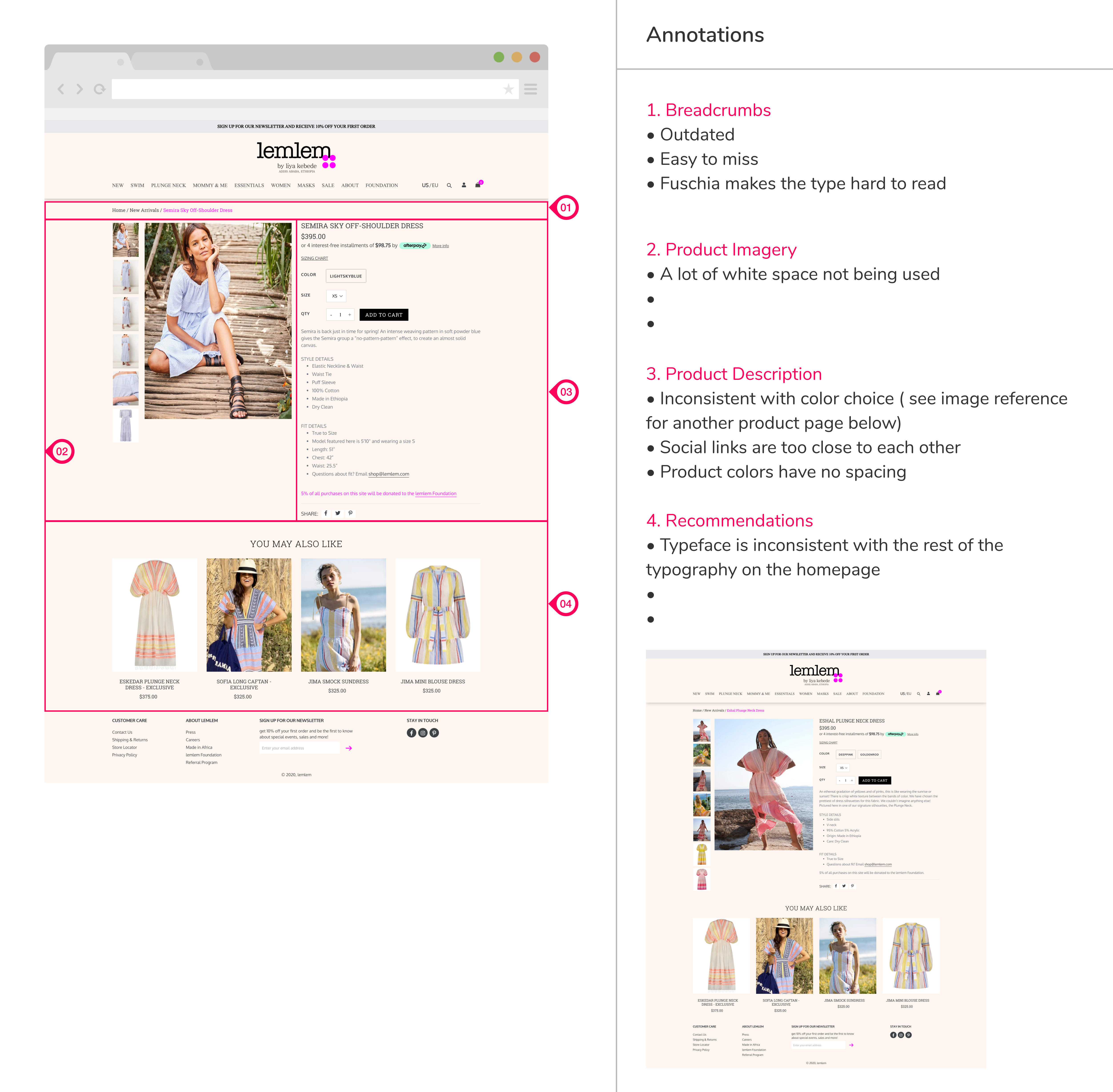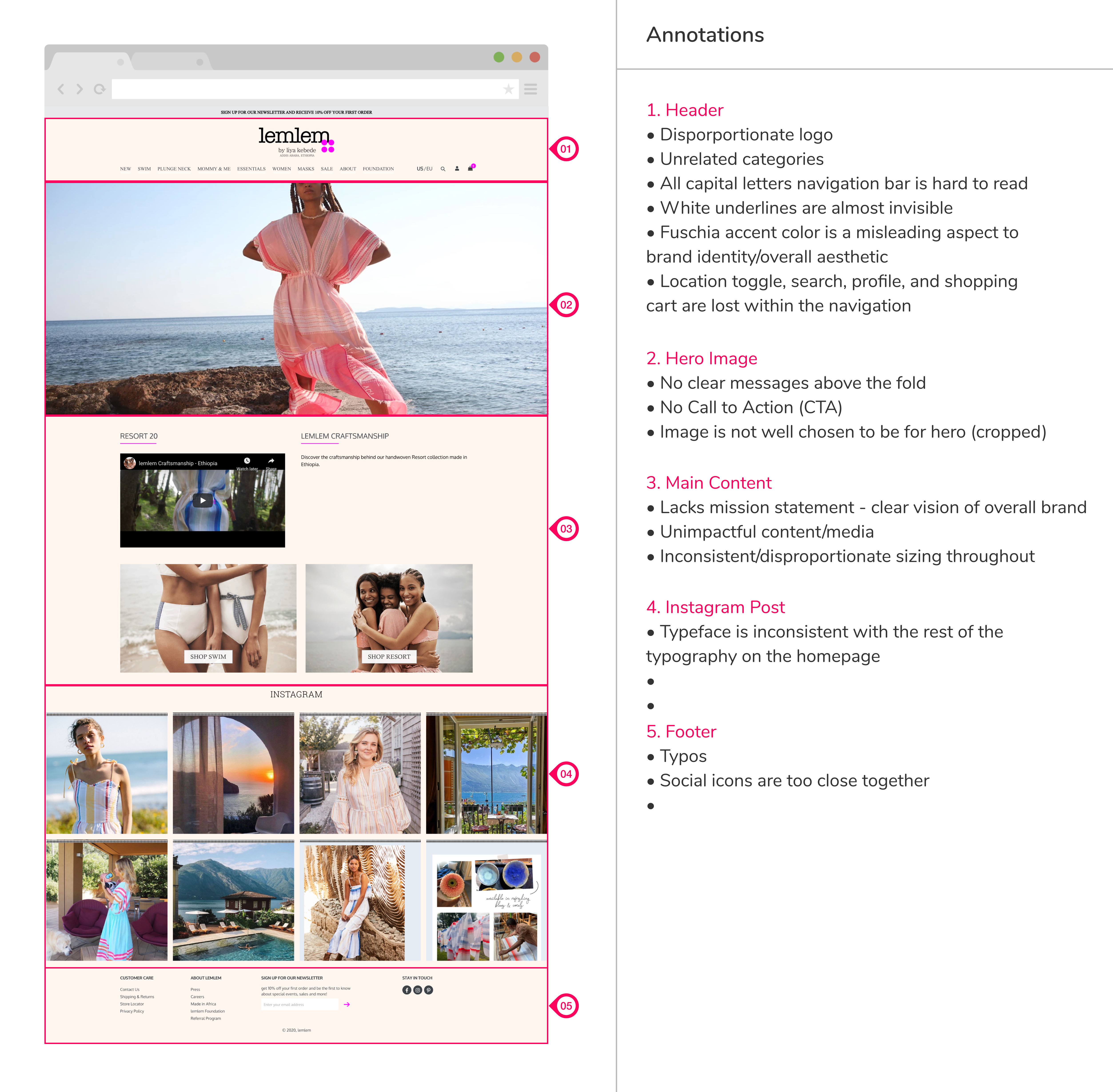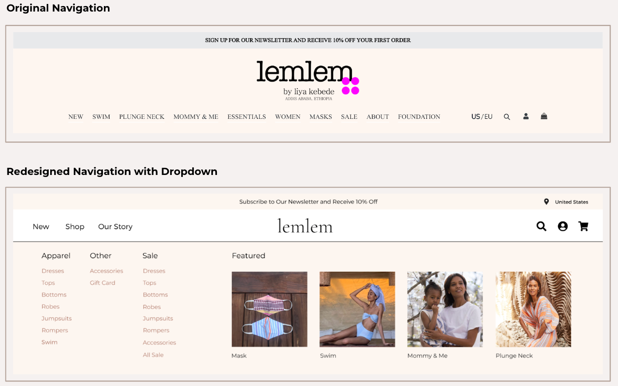 To have a better understanding of Lemlem website’s strengths and weaknesses, we’ve conducted competitor analysis. We chose two direct and indirect competitors. Direct competitors were clearly showing their mission statement and brand story on the homepage with charts and images. Other brands were providing high-quality content imagery, and their modern and clean design adds credibility to their price point.