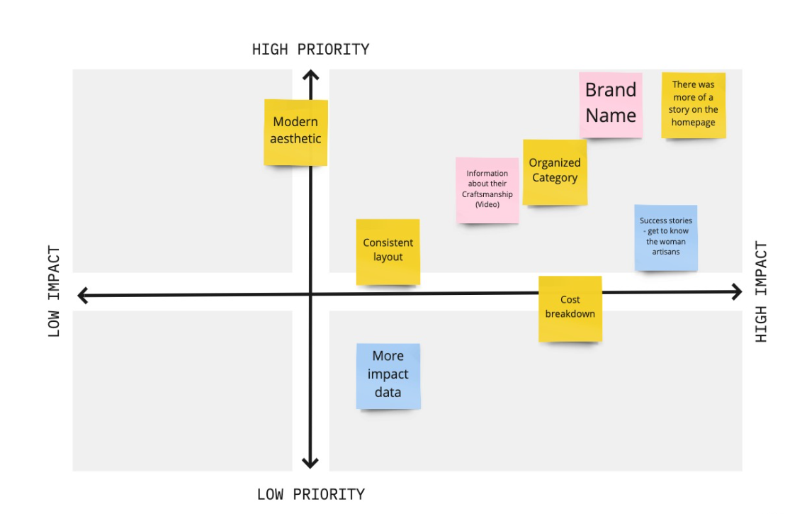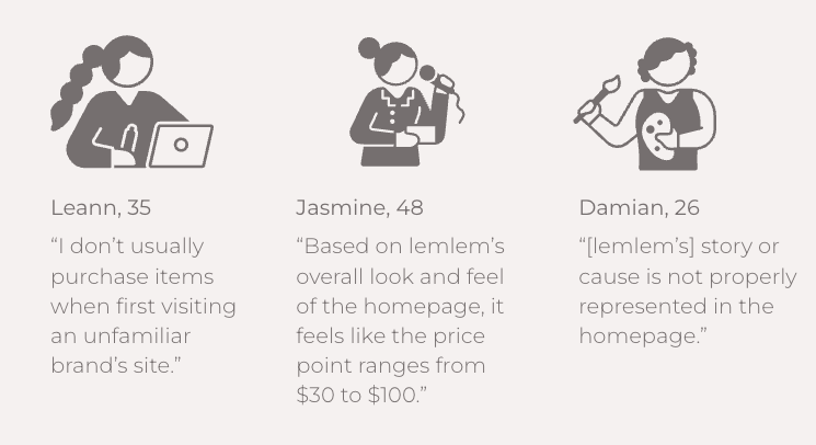 We interviewed 5 people and got similar results as in the SWOT analysis. Most of the participants said the brand story wasn't properly displayed on the homepage, and the high price didn't fit the website's overall look and feel.