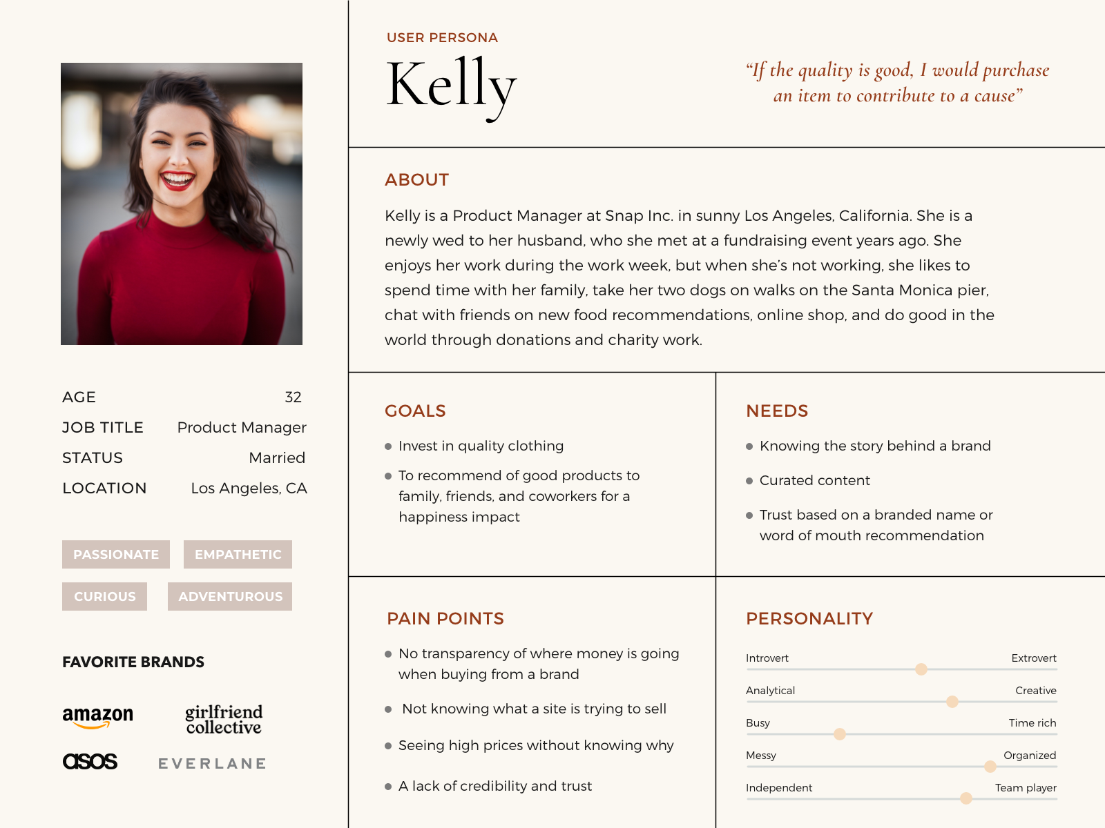 Kelly, a product manager who lives in Los Angeles and recently married her husband who she met at a fundraising event years ago. She loves doing good in the world through donations and charity work and she wants to invest in quality clothing that she can recommend with confidence to her friends and family.