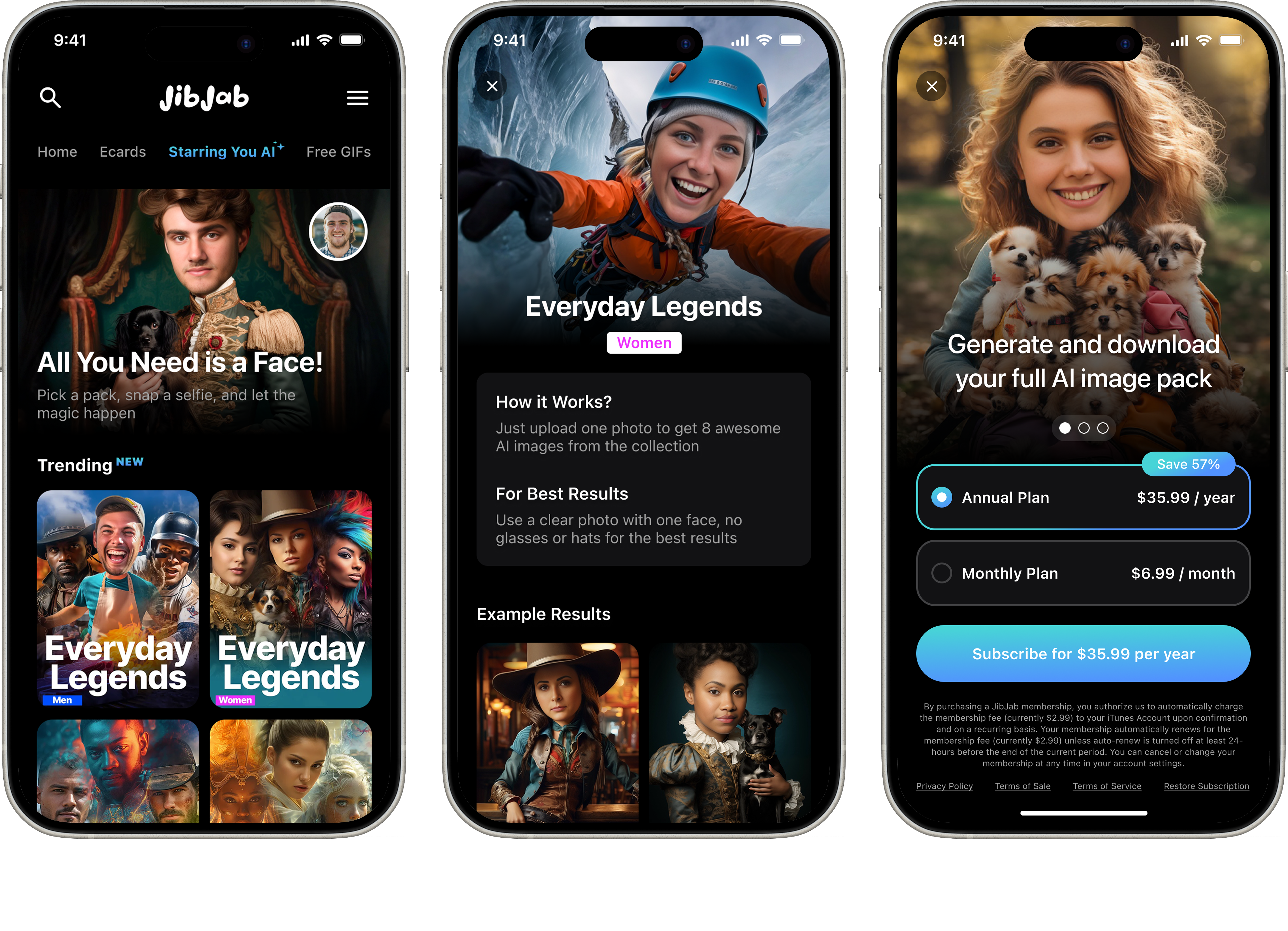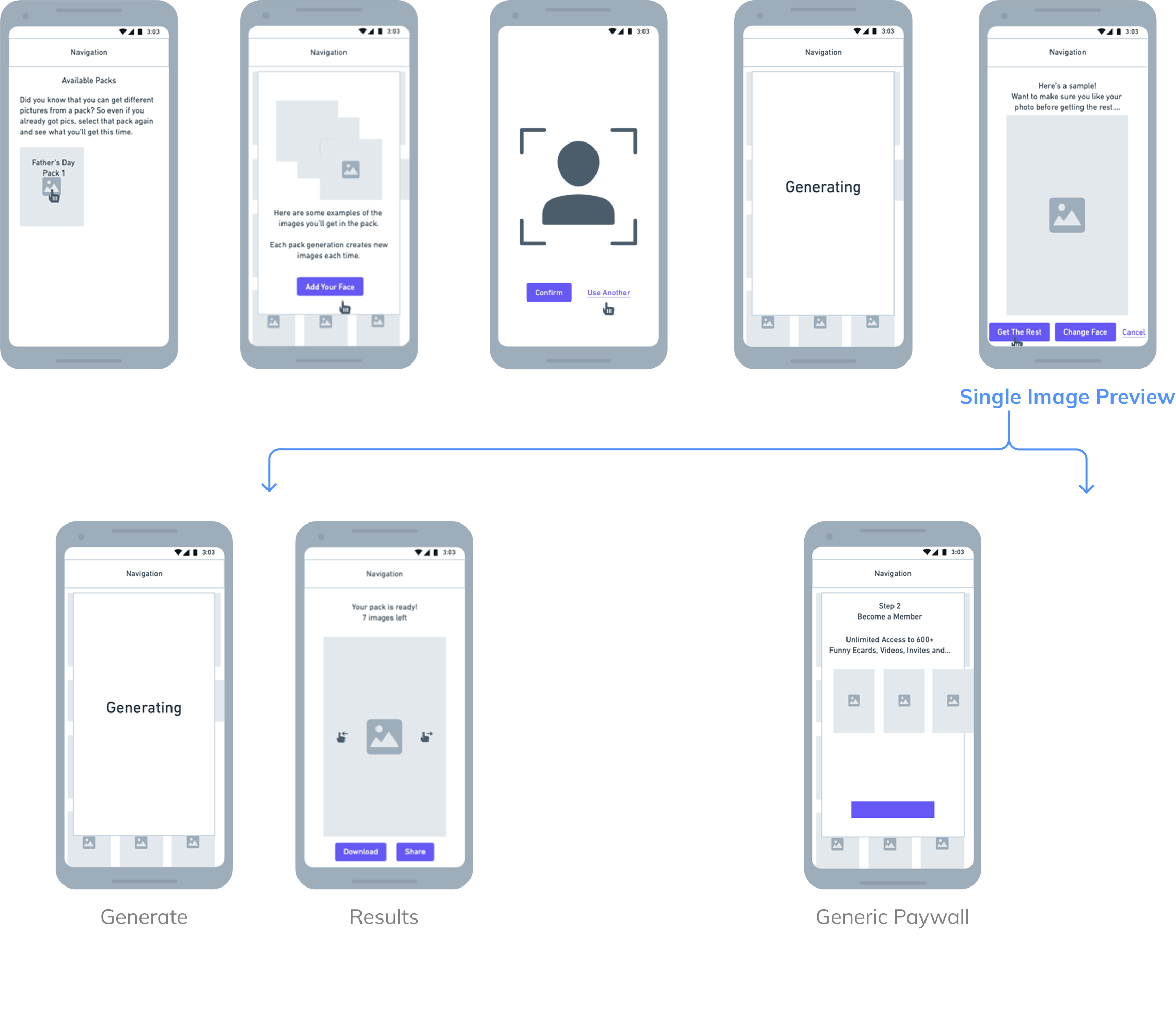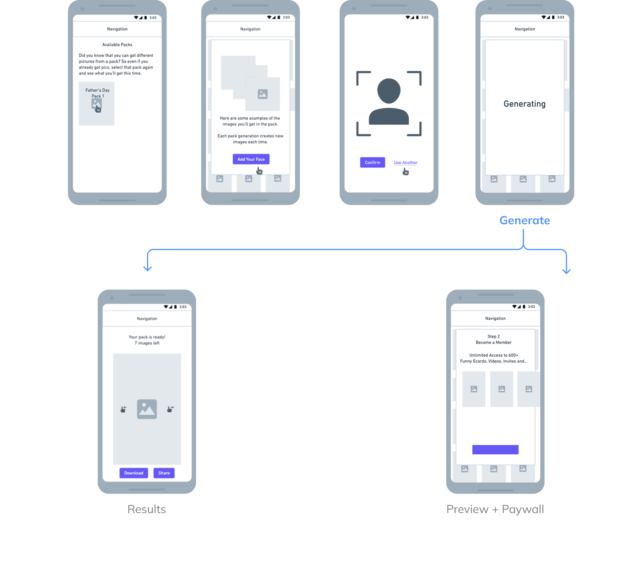 For the early user flow, we created a single, unified flow for both free and paid users — selecting a pack, uploading a photo, confirming, and viewing a single-image preview that acted as a soft gate before the experience branched. From there, free users reached the paywall, while subscribers regenerated to see their full results.